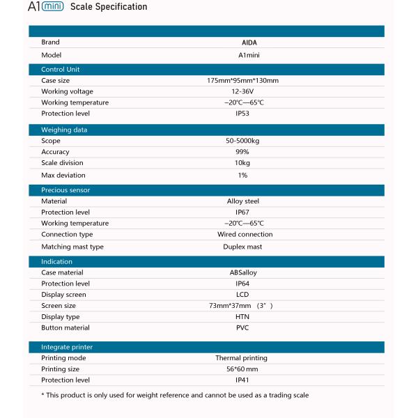 Accurate weighing: Max. capacity 5000kg accuracy 1% division 1kg